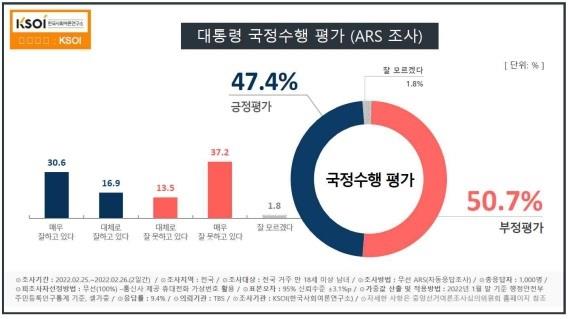 TBS는 한국사회여론연구소(KSOI)에 의뢰해 지난 25일부터 이틀간 전국 만 18세 이상 성인 남녀 천명을 대상으로 '대통령의 국정 수행 평가'를 무선 자동응답방식(ARS)으로 조사했습니다.