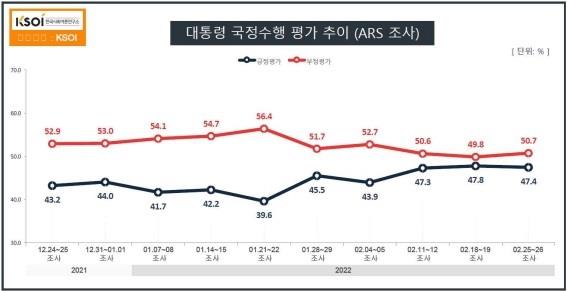 [대통령 국정수행 평가 추이(ARS)<사진=KSOI>] 지난주와 비교해 긍정 평가는 0.4%포인트 하락했고, 부정 평가는 0.9%포인트 상승했습니다.