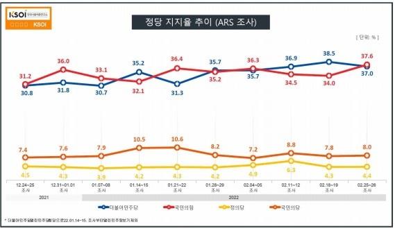 ARS 조사에서 더불어민주당은 37%, 국민의힘은 37.6%의 지지율을 얻었습니다.