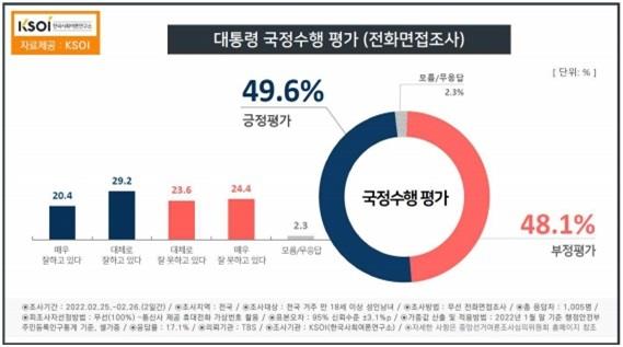 [대통령 국정수행 평가(전화면접)<사진=KSOI>] 같은 기간 전국 만 18세 이상 성인 남녀 천 5명을 대상으로 한 전화면접방식의 조사에서는 긍정적이라는 응답이 49.6%, 부정적이라는 응답은 48.1%로 긍정평가가 1.5%포인트 더 높은 것으로 조사됐습니다.