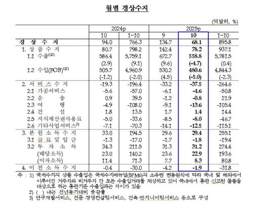 추석 연휴에 따른 조업일수 감소 등으로 지난 10월 우리나라 경상수지가 큰 폭으로 줄었습니다. 한국은행이 오늘(5일) 발표한 국제수지 잠정 통계에 따르면 10월 경상수지는 68억 1,000만 달러(약 10조 447억 원) 흑자로 집계됐습니다. 30개월 연속 흑자 기조가 이어졌지만, 흑자 규모는 전월인 9월(134억 7,000만 달러)과 1년전 같은 달(94억 달러)보다 각각 66억 6,000만 달러, 25억 9,000만 달러 축소됐습니다.다만 올해 들어 10월까지 누적 경상수지 흑자는 895억 8,000만 달러로 지난해 같은 기간(766억 3,000만 달러)보다 약 17% 많습니다.송재창 한은 금융통계부장은 "올해 1∼10월 누적 경상수지 흑자는 사상 최대치"라며 "연간 기준으로 양호한 흐름을 이어가고 있다"고 말했습니다.한국은행은 지난달 27일 경제전망에서 올해 연간 경상수지 흑자 규모를 사상 최대인 1,150억 달러로 예상했습니다.