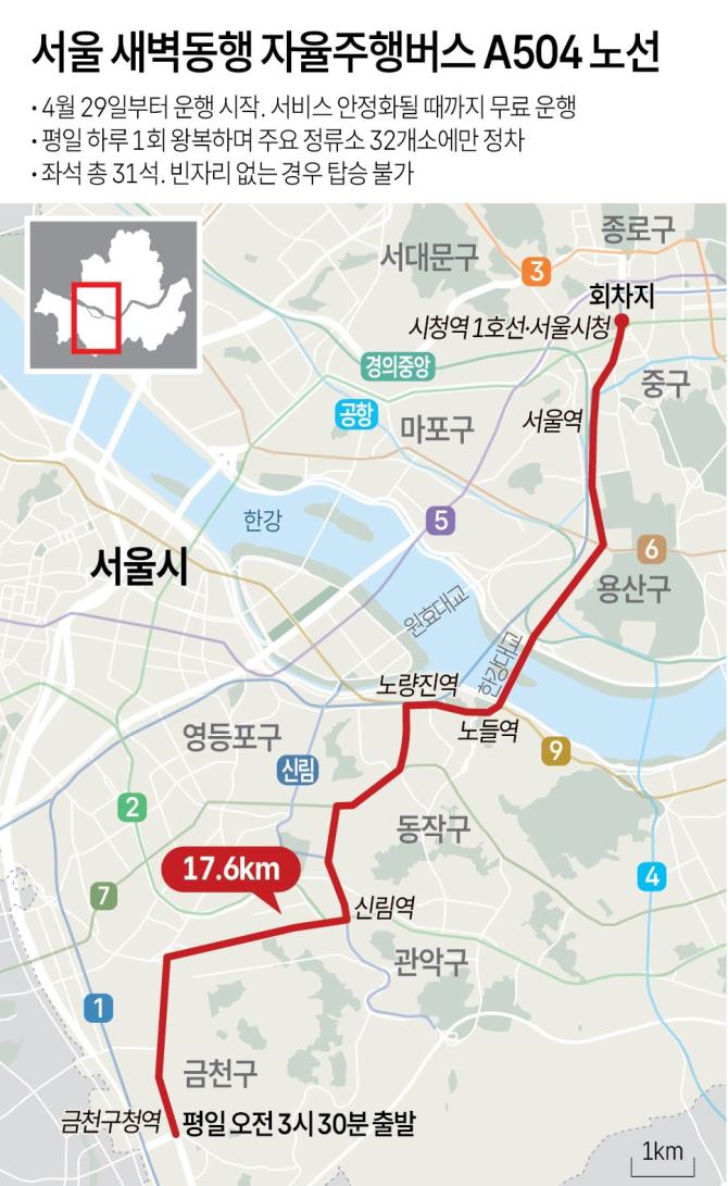 서울 새벽동행 자율주행버스 A504 노선 <사진=연합뉴스>서울시는 금천구청과 서울시청을 오가는 새벽동행 자율주행버스 'A504' 노선이 모레(29일)부터 운행을 시작한다고 오늘(27일) 밝혔습니다.A504 노선은 평일 오전 3시 30분 금천구청을 출발해 신림역, 노량진역, 서울역을 거쳐 시청역까지 17.6㎞ 구간을 하루 1회 왕복하는 새벽동행 자율주행버스입니다.시내버스 첫차보다 30분 일찍 출발하며, 주요 정류소 32곳만 정차하는 '급행 방식'으로 운영됩니다.서비스가 안정화될 때까지 당분간 무료로 운행되며 무료 운행이 끝나고나서는 승하차 시에는 일반 시내버스와 동일하게 교통카드를 태그해야 합니다.안전상의 이유로 잔여 좌석이 없으면 승객을 태울 수 없으므로 탑승 전 버스 앞부분의 LED 좌석표시기를 통해 빈자리가 있는지 확인하고 빈자리가 있을 때 탑승이 가능합니다.
