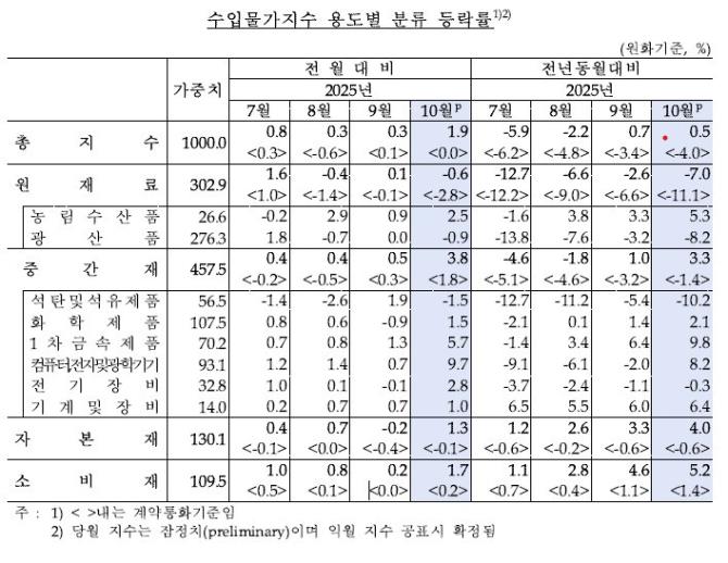 지난달 원/달러 환율이 2% 넘게 오르면서 수입 물가가 9개월 만에 가장 큰 폭으로 상승했습니다.한국은행이 오늘(14일) 발표한 수출입물가지수 통계에 따르면 올해 10월 기준 수입물가지수(2020년 수준 100)는 138.17로, 9월(135.56)보다 1.9% 올랐습니다.수입물가지수는 7월부터 넉 달 연속 올랐으며, 10월 상승 폭은 지난 1월(2.2%) 이후 9개월 만에 가장 컸습니다.